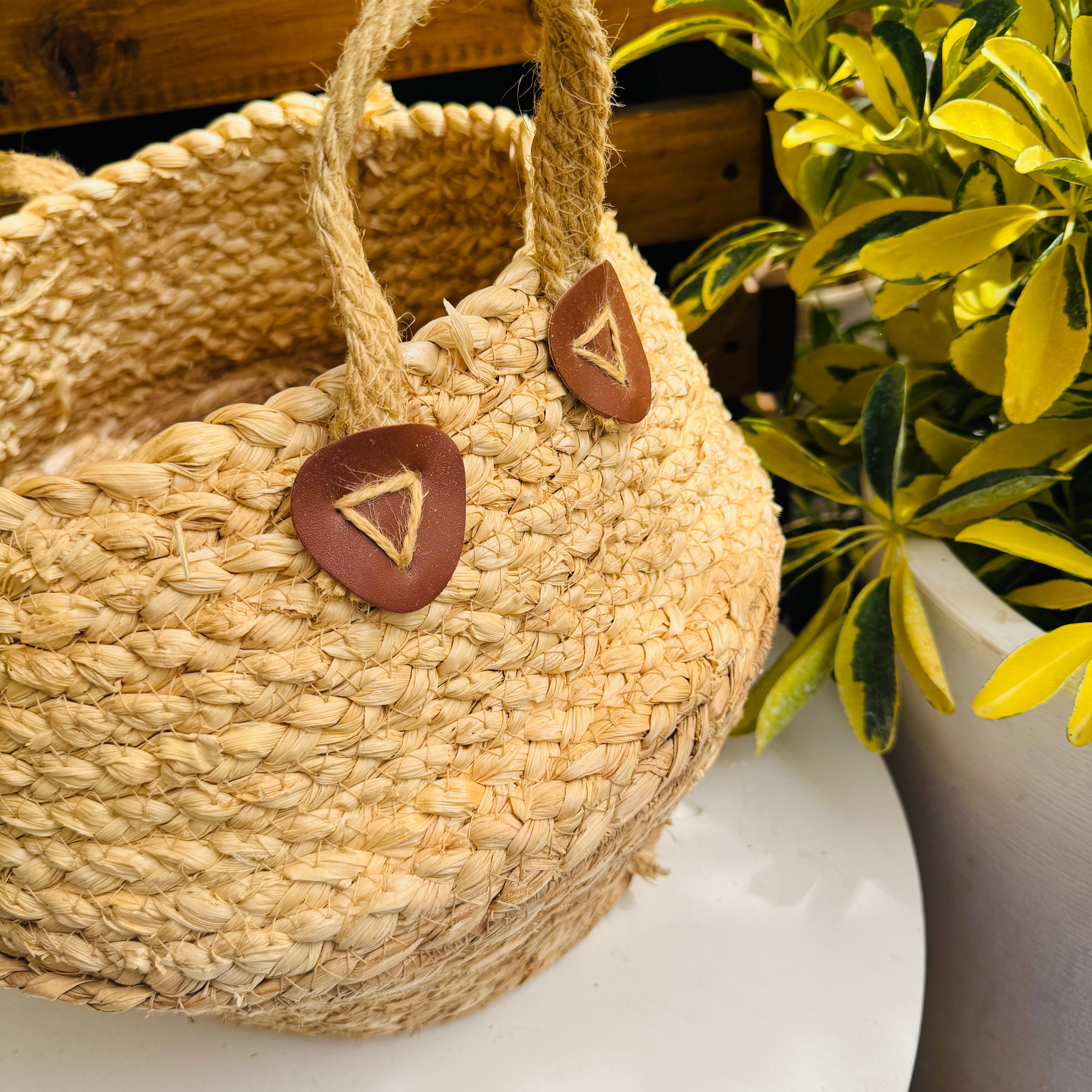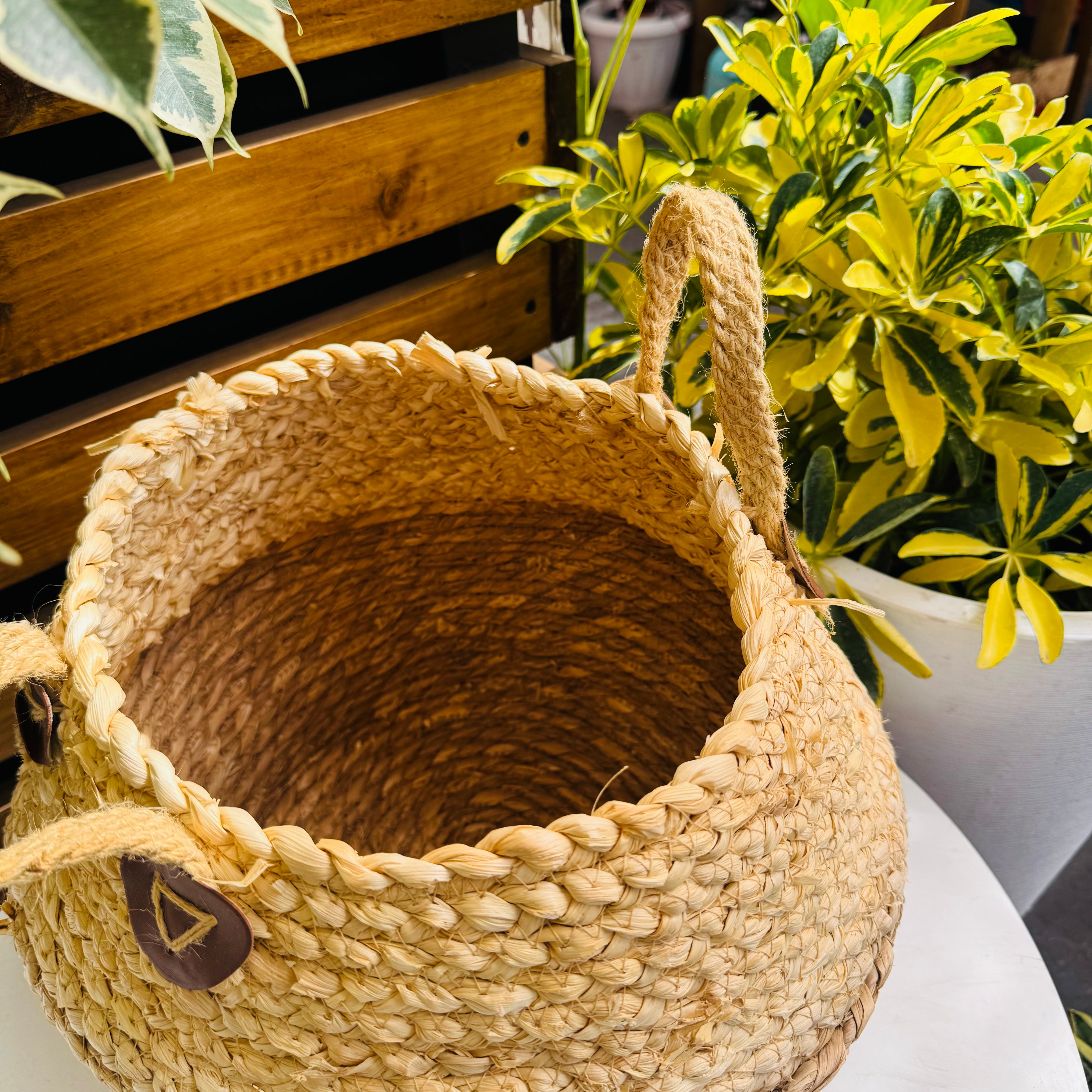 Canasto decorativo hecho con fibras naturales que aportan calidez y un estilo acogedor a cualquier espacio. Incluye asas laterales que permiten mover tus plantas fácilmente de un lugar a otro, combinando funcionalidad y diseño. Ideal para cubrir macetas y realzar la belleza de tus plantas en interiores.